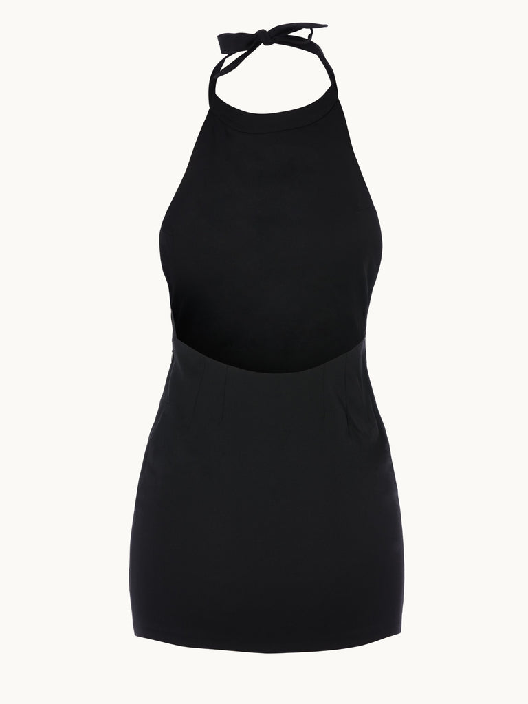 Elevate your wardrobe with the Drama minidress, a versatile piece designed to transition effortlessly from daytime elegance to evening sophistication. Featuring sophisticated crossback halterneck straps and an alluring open-back design, this dress is your perfect choice for any setting.