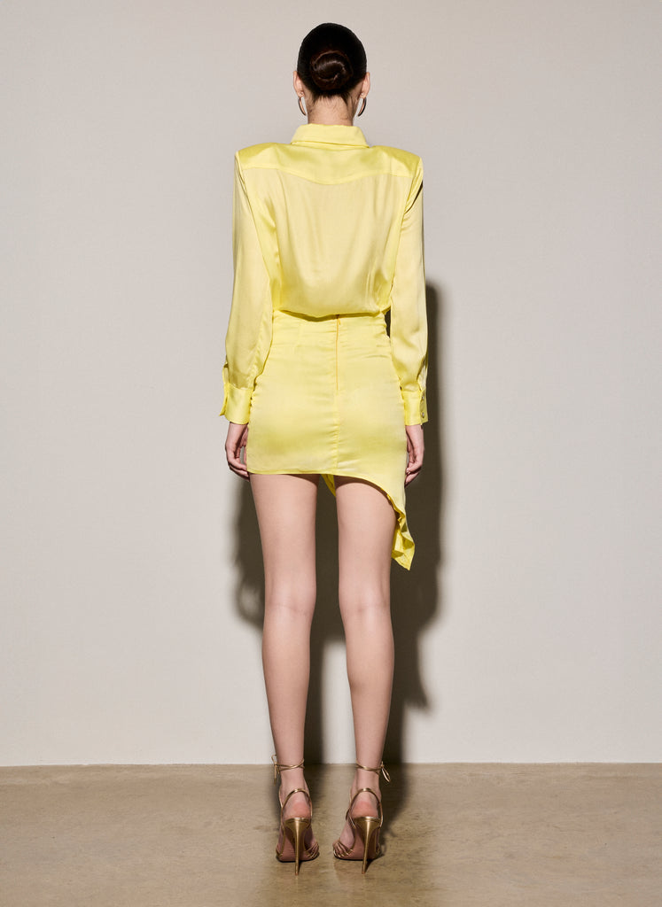 A sculpting midi skirt in silk-cotton blend, featuring our signature crystal buckle and a fluid draped panel. Cut to sit high on the waist, with ruched detailing and an asymmetric hem that moves with intention. Lightweight, unlined, and made to command attention.