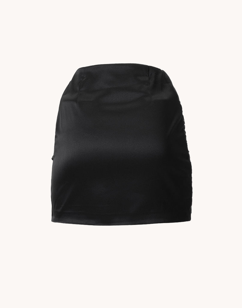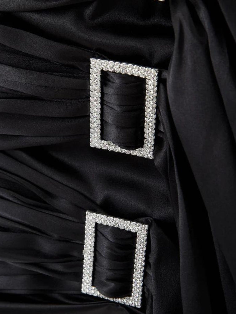 A jewel-like mini skirt crafted from premium silk taffeta. Designed with dramatic ruffles and three crystal-embellished buckles, it strikes the perfect balance between elegance and edge. A statement piece made for unforgettable nights.