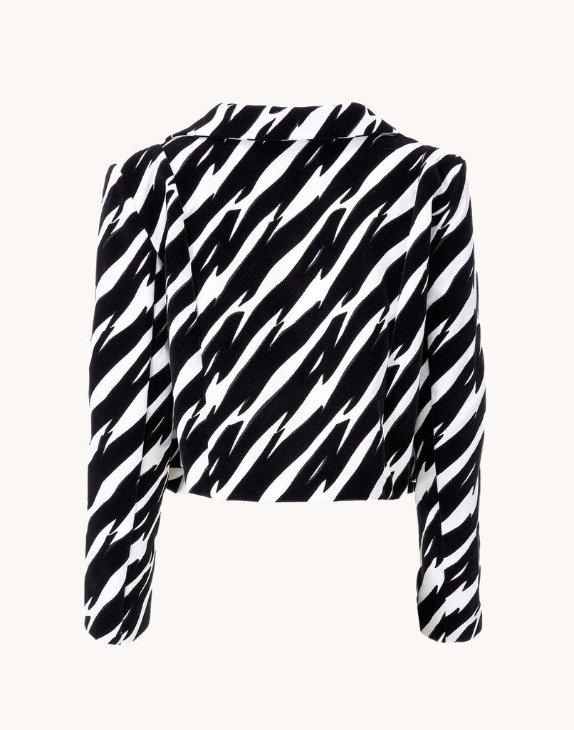 Step into the spotlight with our eye-catching zebra printed jacket, a fashion-forward piece that combines daring patterns with luxurious fabrics. Featuring padded shoulders and an asymmetric front cut, this jacket is designed to make a statement wherever you go.