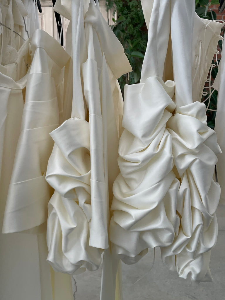 Every piece is handmade in our atelier, using fabrics sourced from the archives of luxury maisons. Deadstock is reborn into modern icons — from fluid silks to spun yarns embroidered with translucent sequins. Each stitch reflects our devotion to detail, each buckle a reminder that true luxury lies in scarcity.